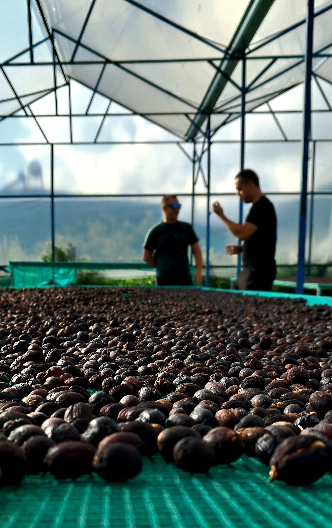 The selection, washing, and floating of coffee cherries are crucial because we retain the entire fruit on the beans during the drying process. One of the main challenges in producing naturally processed Arabica, particularly at higher elevations, is the climatic conditions during the harvest season. This period often brings significant rainfall and high humidity, which can be quite challenging when producing naturals.